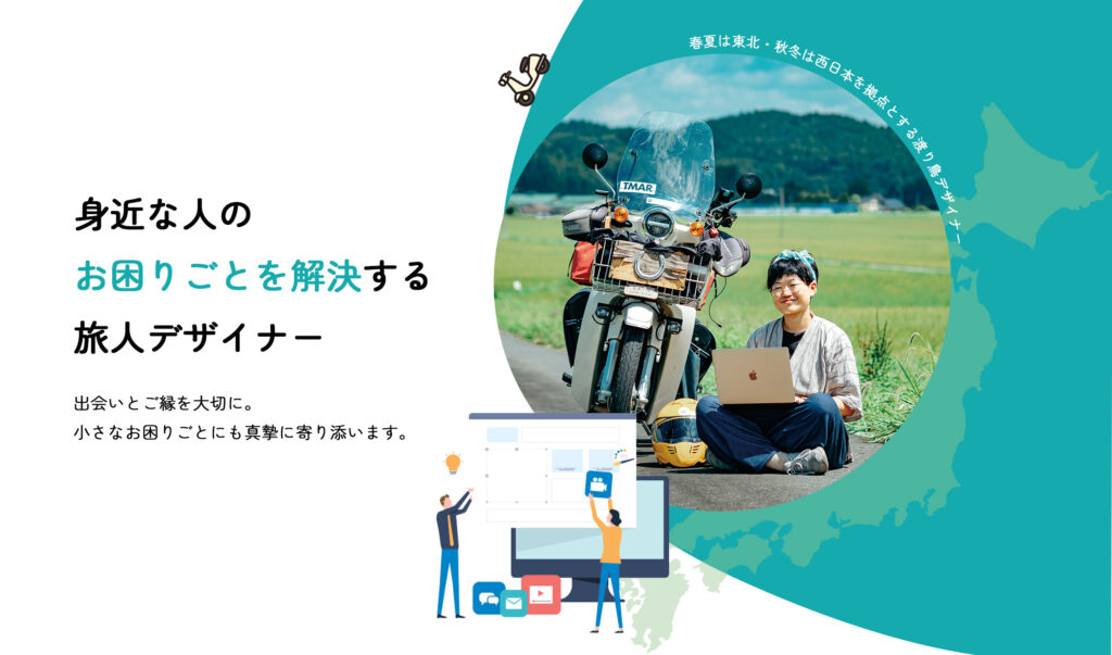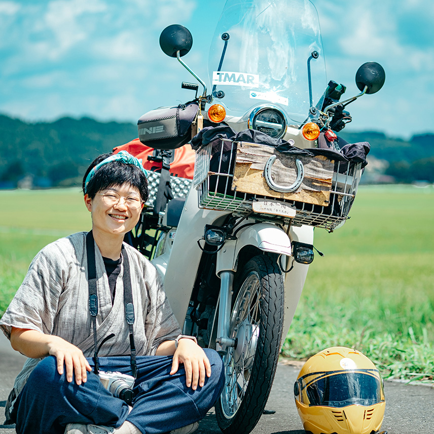 デザイナーとして独立し、働く場所が自由になったことをきっかけに、2022年夏〜2023年夏まで、原付バイク「スーパーカブ」で日本一周を行いました。出発前にクラウドファンディングで資金調達を行い、支援者様に会いに行く旅で、ご縁を繋ぎました。旅中も、毎日デザインのお仕事をして、旅するデザイナーとしての生き方が確立しました。